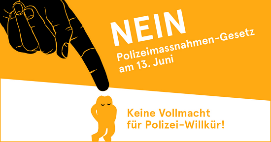 Das Polizeimassnahmen-Gesetz gefährdet die Grund- und Menschenrechte der Schweizer Bevölkerung. Es stellt Menschen unter Generalverdacht, hebelt die Unschuldsvermutung aus und überlässt der Polizei einen zu weitgehenden Ermessensspielraum. Unterstützen Sie deshalb die NGO-Koalition gegen das Polizeigesetz, und stimmen Sie am 13. Juni NEIN zu Polizei-Willkür!