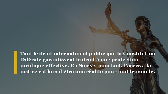 Tant le droit international public que la Constitution fédérale garantissent le droit à une protection juridique effective. En Suisse, pourtant, l’accès à la justice est loin d’être une réalité pour tout le monde. Les personnes faisant déjà l’objet de discrimination et d'exclusion structurelles ainsi que celles dans une forte relation de dépendance vis-à-vis de l'État sont particulièrement touchées par ce déficit de protection. Les femmes, les membres de minorités ethniques, les personnes en situation de handicap, les gens du voyage, les personnes transgenres, les personnes demandeuses d'asile, les bénéficiaires de prestations d'invalidité et d'aide sociale ou les personnes en détention sont autant de groupes qui rencontrent des difficultés à surmonter les obstacles de la justice.