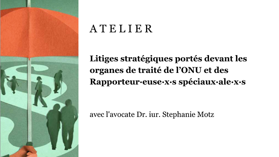 Le 18 septembre 2023 de 12h15 à 13h45, le premier atelier consacré aux litiges stratégiques portés devant les organes de traité et des Rapporteur·euse·x·s spéciaux·ale·x·s de l’ONU aura lieu. À cette occasion, la Me Dr iur. Stephanie Motz retracera son expérience en matière de procédures dans les domaines du climat, du droit des femmes, du profilage racial et de la migration.