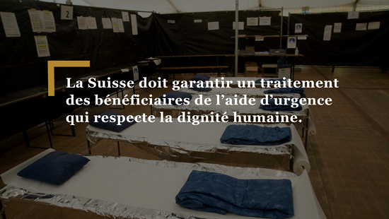 Le système de l’aide d’urgence viole les droits humains en Suisse. Les conditions actuelles menacent particulièrement la santé mentale et physique des requérant·e·s d’asile débouté·e·s. La Suisse doit garantir un traitement et un hébergement des bénéficiaires de l’aide d’urgence qui respecte la dignité humaine.