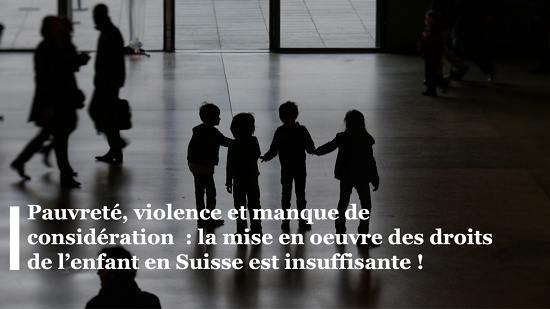 La pauvreté frappe aussi particulièrement les enfants. Selon l'Office fédéral de la statistique, 108 000 enfants sont directement touché·e·s par la pauvreté en Suisse et 155 000 autres vivent dans des conditions précaires, juste au-dessus du seuil de pauvreté. Les enfants qui grandissent dans la pauvreté sont marqué·e·s par la précarité matérielle, sont victimes d'exclusion sociale et ont moins de chances de s'instruire. Ces conditions défavorables ne peuvent plus s’améliorer ni être compensées par la suite à l'âge adulte. La pauvreté des enfants est due à des coûts de la vie élevés, de faibles revenus parentaux et à un manque de possibilités de concilier travail et vie de famille. Pour éviter que les enfants ne grandissent dans la pauvreté, le Réseau suisse des droits de l'enfant demande l’introduction de prestations familiales complémentaires.
