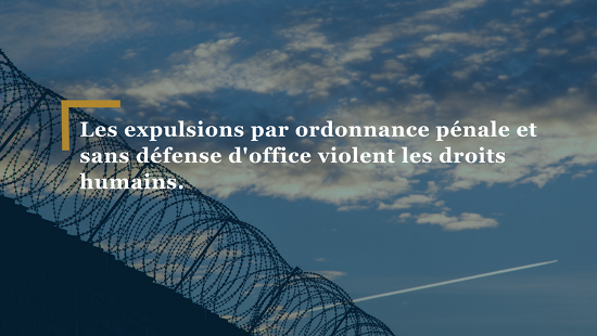 Le Parlement examine actuellement une motion visant à autoriser l'expulsion par ordonnance pénale et sans défense d’office dans des cas mineurs mais évidents. S’il est accepté, cet objet porterait atteinte au droit à un procès équitable. Alors que le Conseil national approuve la proposition dans son intégralité, le Conseil des États rejette les points problématiques, préoccupé par des questions relatives à l'État de droit.