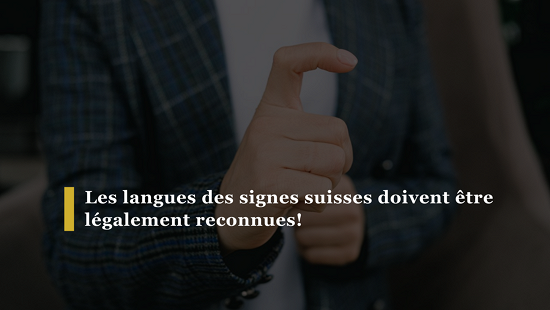 Le Conseil fédéral et le Parlement doivent assurer la reconnaissance juridique des langues des signes. Celle-ci est nécessaire pour promouvoir la participation des personnes sourdes et malentendantes à la vie de la société ainsi que pour garantir le respect de la Convention des Nations Unies relative aux droits des personnes handicapées.