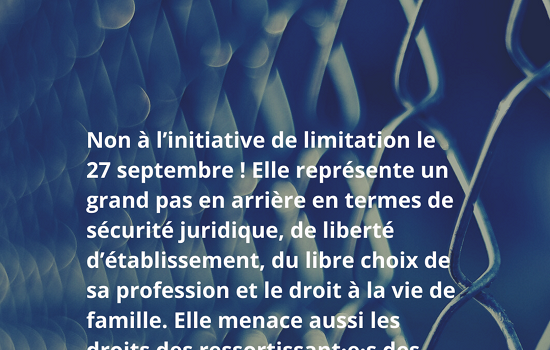 Au regard des droits humains, il apparaît distinctement que l’initiative de limitation représente un important recul en termes de protection juridique, de liberté d’établissement, du libre choix de sa profession et du droit à la vie de famille. Elle menace indirectement les droits des ressortissant·e·s d’Etats tiers et des requérant·e·s d’asile. Pour toutes ces raisons, l’initiative de limitation mérite un NON clair et fort le 27 septembre.
