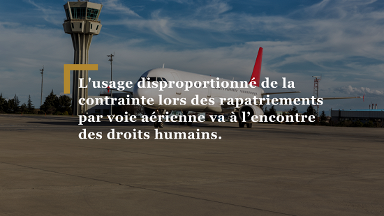 Depuis juillet 2012, la Commission nationale de prévention de la torture (CNPT) organise des escortes aériennes sur des vols spéciaux et fait un rapport annuel sur les pratiques des autorités. À ce jour, la commission observe de manière récurrente des «pratiques policières inappropriées» et un recours excessif aux entraves préventives lors des rapatriements par voie aérienne. Selon son dernier rapport de suivi de l’exécution, entre avril 2020 et mars 2021, des menottes partielles ont été utilisées dans plus de la moitié des renvois au niveau d'exécution 4. Il s’agit de la mise en place de menottes, de manchettes pour les pieds et le haut du bras ainsi que d’une ceinture, les poignets étant fixés à la sangle. La commission estime que le menottage partiel et la surveillance des personnes concernées sont en partie disproportionnés. Dans environ 10 % des cas, il a en outre été fait usage d’entraves pour le corps entier, les pieds et les jambes étant fixés par des manchettes et des attaches-câbles. La CNPT fait également état de l’utilisation de menottes métalliques, de casques de protection et de filets à crachats. Dans un cas isolé, une personne a même été amenée à l'avion attachée à un fauteuil roulant, ce qui constitue une pratique dégradante selon la CNPT. De plus, dans plusieurs cas, les personnes concernées ont été informées de manière lacunaire ou non compréhensible de leur transfert et des mesures de contrainte.